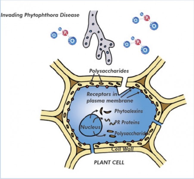Phosphite heightens a plant's natural defense mechanisms so diseases are more easily repelled. Phosphite encourages the nucleus of a plant cell to produce defensive molecules, such as phytoalexin, which attack disease directly. Phosphite also enhances the production of polysaccharides, which strengthen the cell wall to add additional protection, and stimulates enzymatic "alarm signals" to cells that have not yet been attacked.