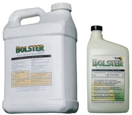 Bolster is a concentrated plant-growth supplement developed to prepare plants for improved growth in sub-optimal and stress conditions, such as heat, cold, drought, heavy traffic, and saline soils.  North Atlantic ascophyllum nodosum seaweed is an excellent natural source of auxins, cytokinins, gibberillins, and trace minerals, and Bolster scientifically balances this with humic acids and a specially chelated, readily available iron to help plants develop to their optimum potential.