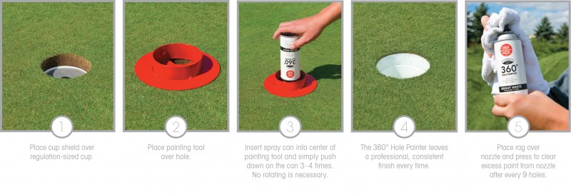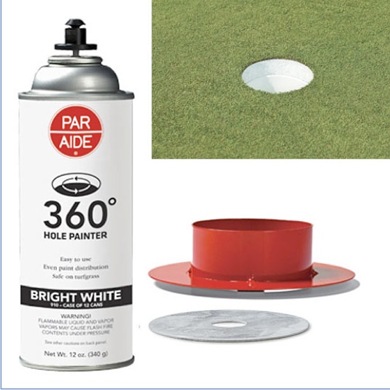 The 360° Hole Painter is a new and innovative tool that paints the top 25mm above the cup Bright White using a unique nozzle that sprays 360 degrees all at once. Simple and easy to use, the 360° Applicator greatly increases visibility of the cup while ensuring a consistent, professional finish every time, with no dripping on the cup, overspray on the green, or “shadowing” of the paint.